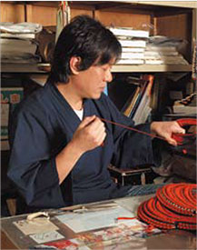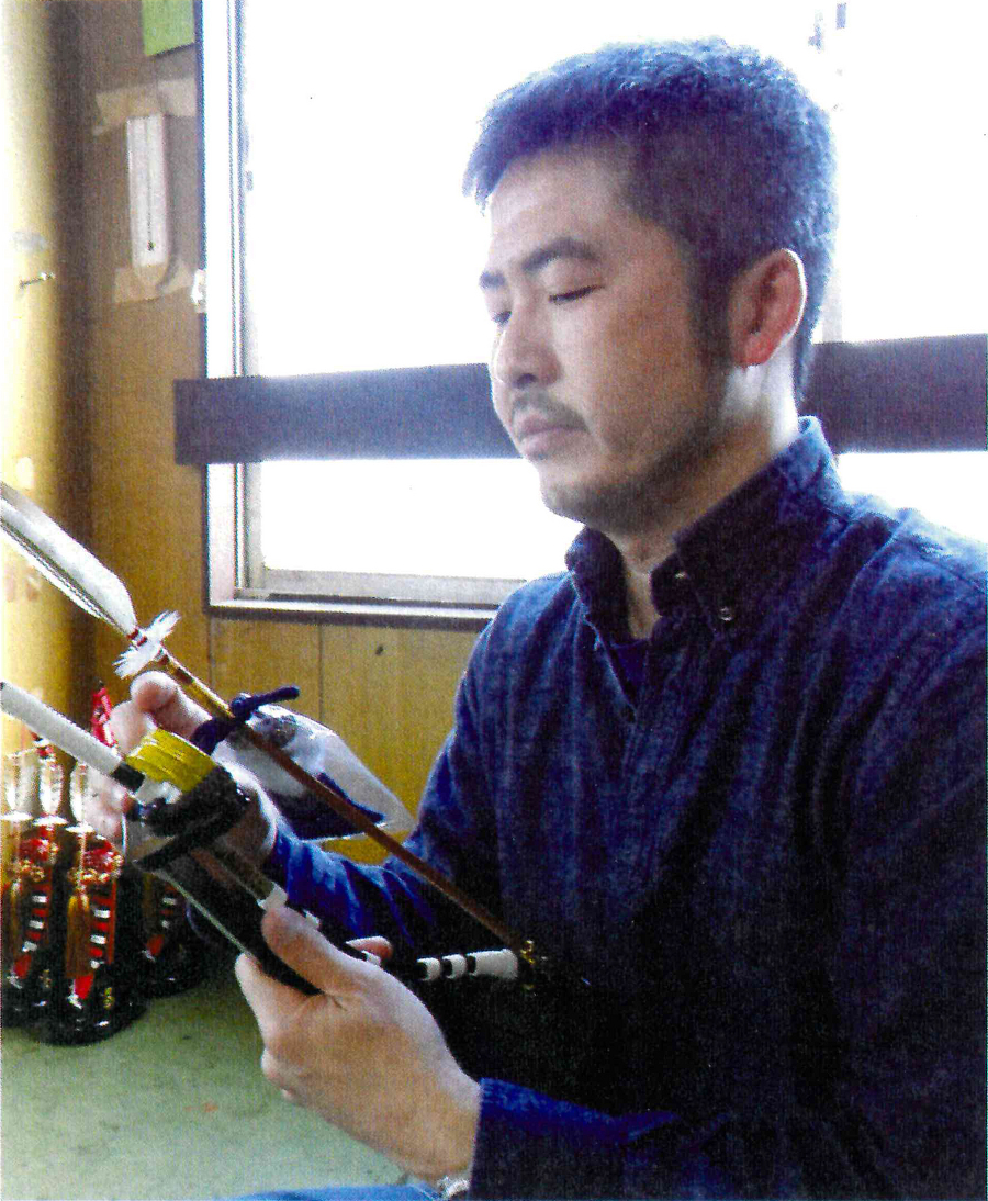 大学卒業後、商社勤務を経て父である先代の下で弓太刀揃の制作技術を学ぶ。曾祖父の代から受け継がれた制作方法、素材を活かしながら、格調高い大きなものから現代の生活スタイルにマッチした小型のものまで幅広く制作している。特に品質を重視しつつ、鎧・兜を際立てさせる脇役であっても「一人にひとつの大切なもの」を意識して、細部にまで心を行き届かせる。