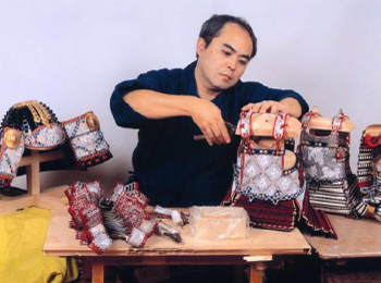 長鍬形、三つ鍬形等の威風堂々たる斬新な兜が人気で、細かい編み目の美しさや細部にわたる手仕上げの巧妙さは、長年の修練の賜物です。