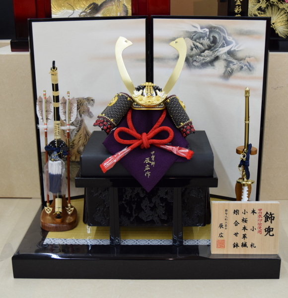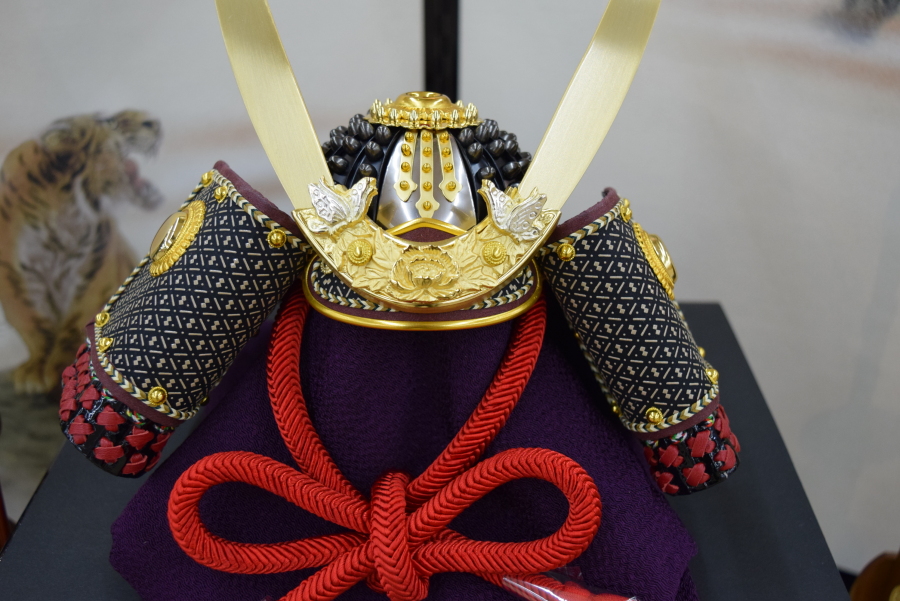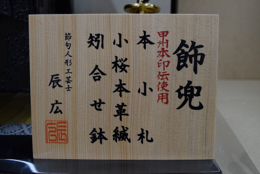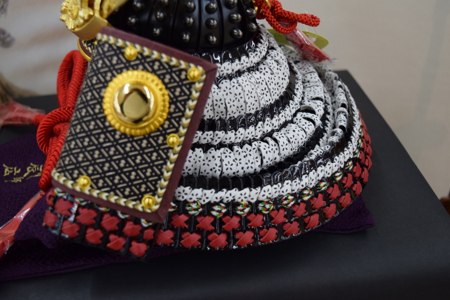 兜の威(紐)は小桜模様の入った本革を使用しています。吹き返しは甲州本印伝(鹿革)を使用しており、素材にこだわった逸品となっております。