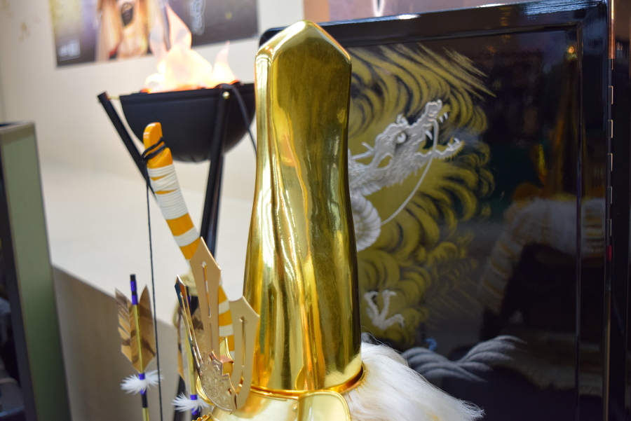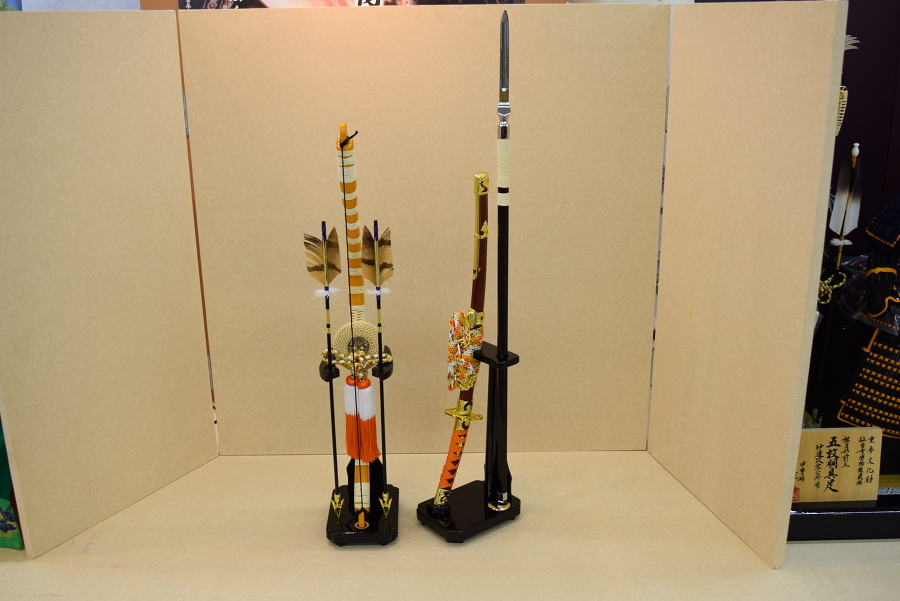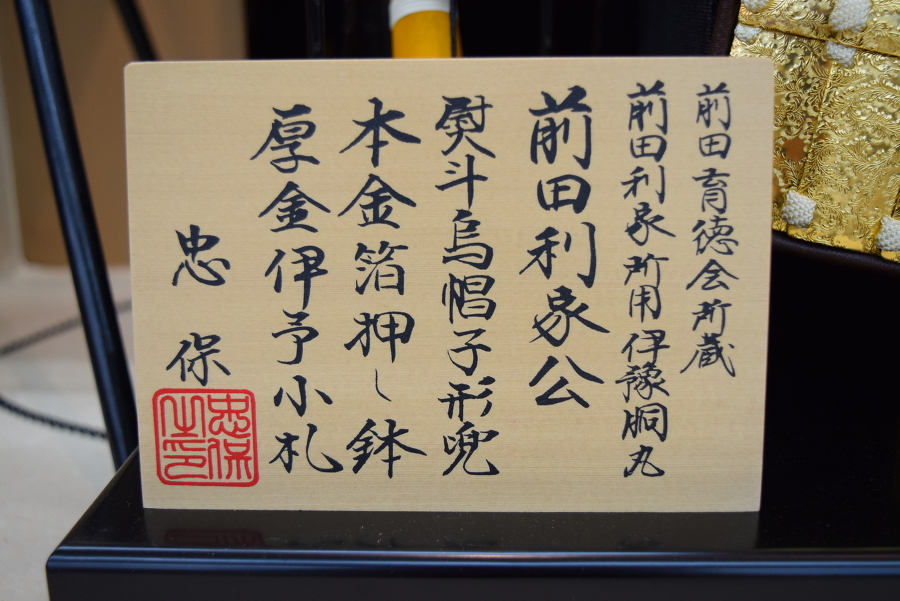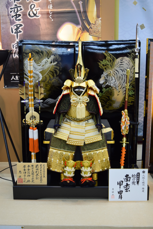前田利家南蛮甲冑、鯰の兜は金沢本金箔押し仕上げで、太刀には槍の名手でもあった利家にちなみ槍をつけており存在感を出しております。