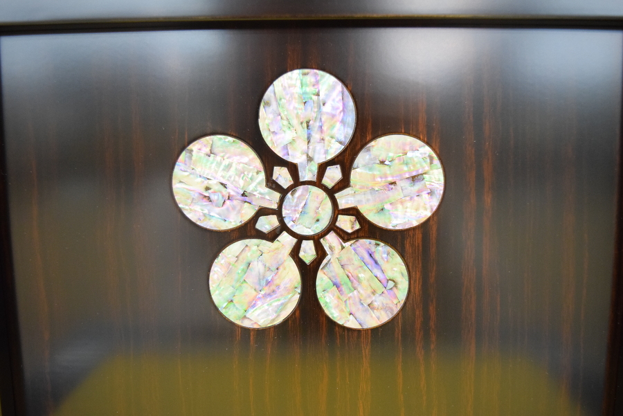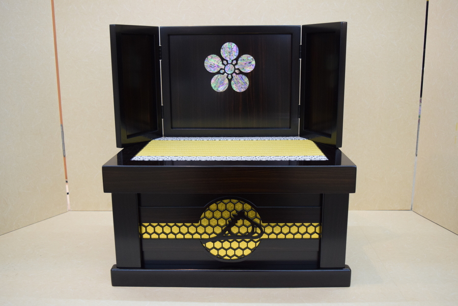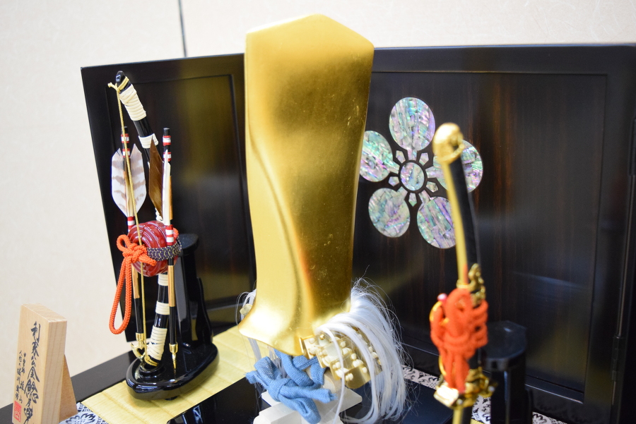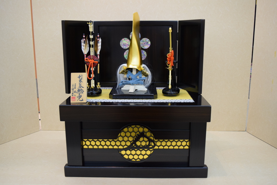 鯰の兜は金沢本金箔押し仕上げで、黒檀塗収納箱には前田利家の花押(かおう)を、屏風には前田家の家紋である梅鉢を螺鈿(らでん)であしらいました。お片付けの際は、兜、弓太刀、屏風などすべて一箱に収まります。