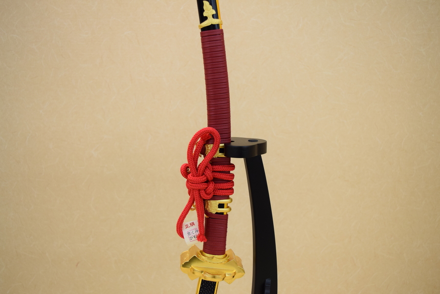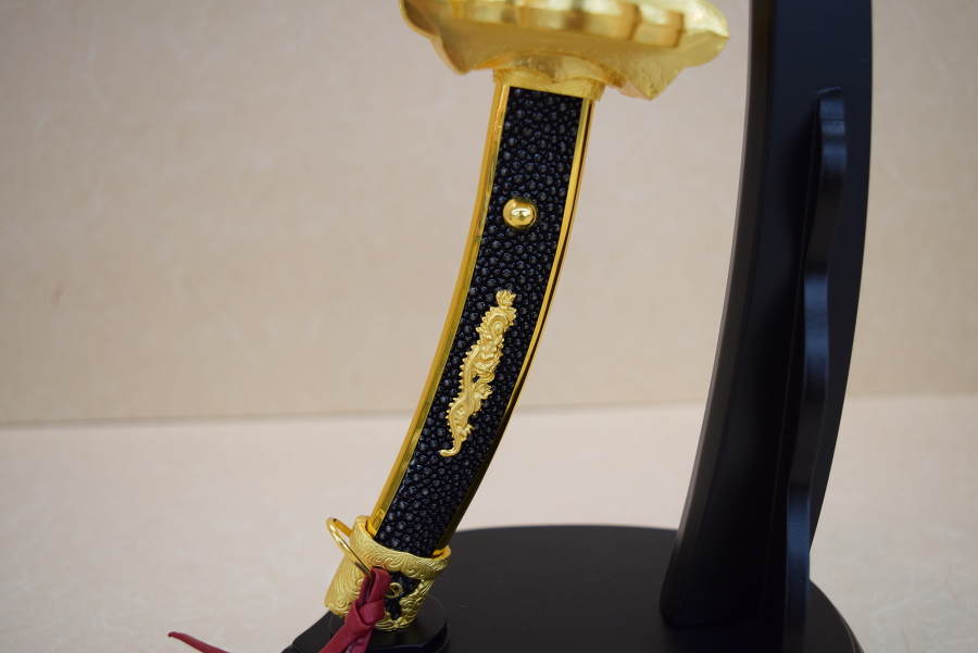 前田利家南蛮甲冑【PREMIUM】、鯰の兜は金沢本金箔押し仕上げで、太刀の鞘は本革を巻き、柄は鮫革仕上げで重厚感を出しております。
