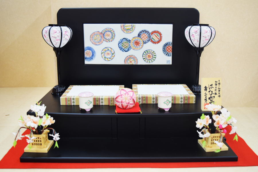衝立屏風は九谷焼、御道具には九谷焼貝桶、加賀花手まりを使用し、