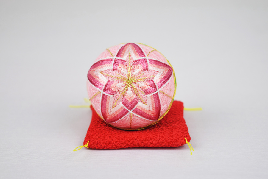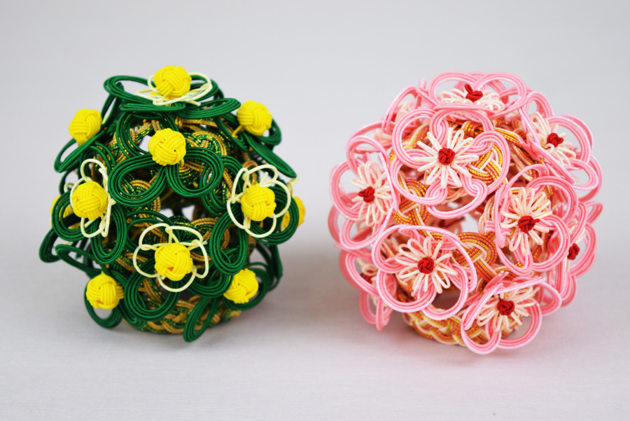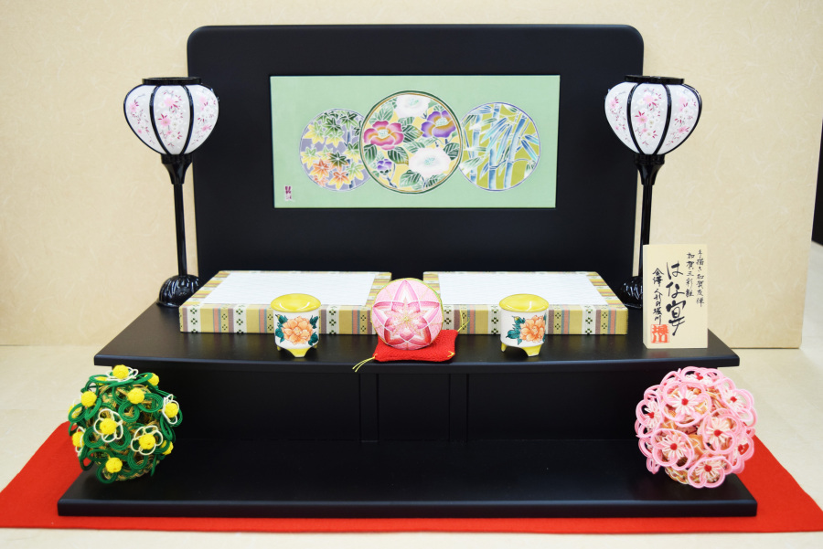 衝立屏風は手描き加賀友禅、お花は加賀水引き、御道具には九谷焼貝桶、加賀花手まりを使用し、