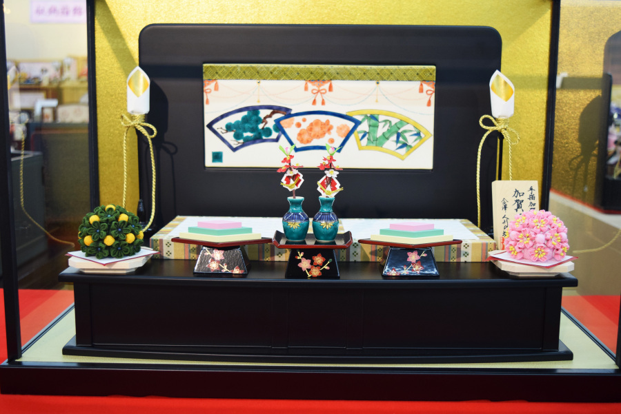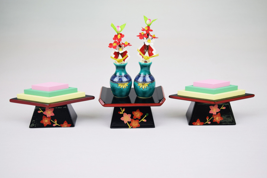 人形以外にも石川県の伝統工芸を使用したコンパクトな雛人形セットになっております。