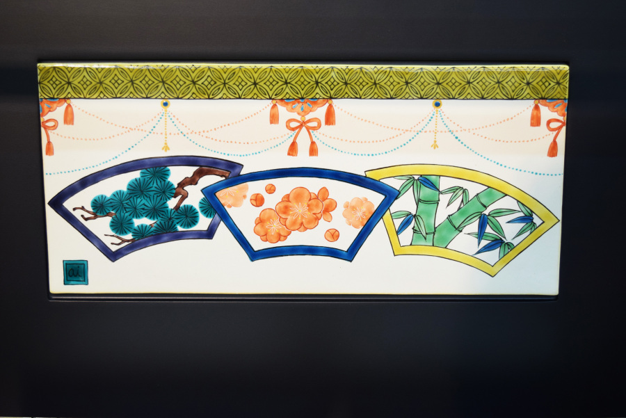 衝立屏風は九谷焼、お花はつまみ細工、御道具には山中塗、九谷焼徳利を使用しております。