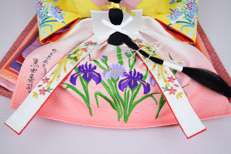 お姫様のお袖には手描き加賀友禅、さらに裳袴には刺繍で誕生花が入ります。